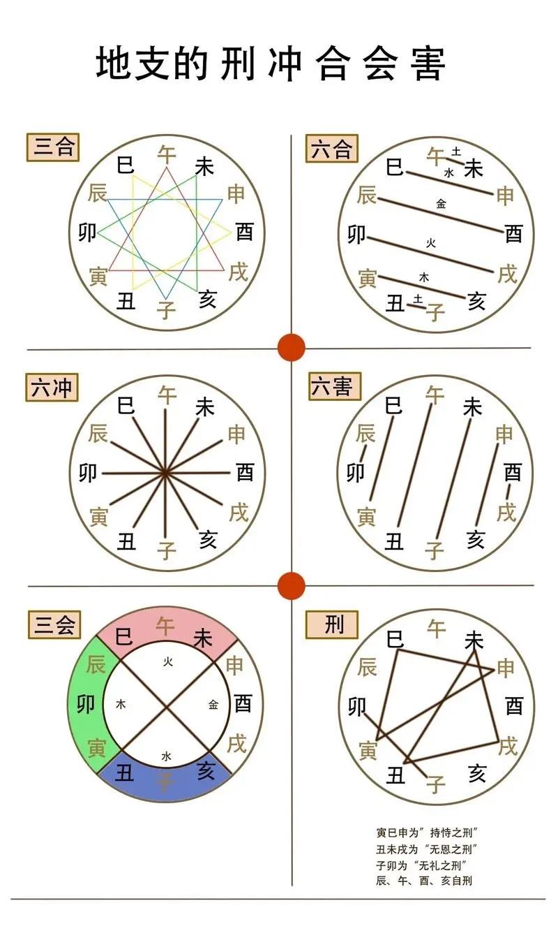 地支之刑、冲、会、合、害【地支三合】:半合是指三合中任二个地支出现。