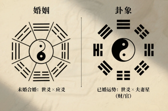 测婚姻是六爻预测的经典主题,其逻辑分为两大核心场景:未婚合婚与已婚运势。未婚者重点关注“世爻(求测者)” 与“应爻(对方)”的互动,聚焦“能否成婚”;已婚者则聚焦“世爻”与“夫妻星(男财女官)” 的关系,判断“婚姻稳定性”。二者的核心差异在于:未婚看“双方互动”,已婚看“夫妻联结 ”。